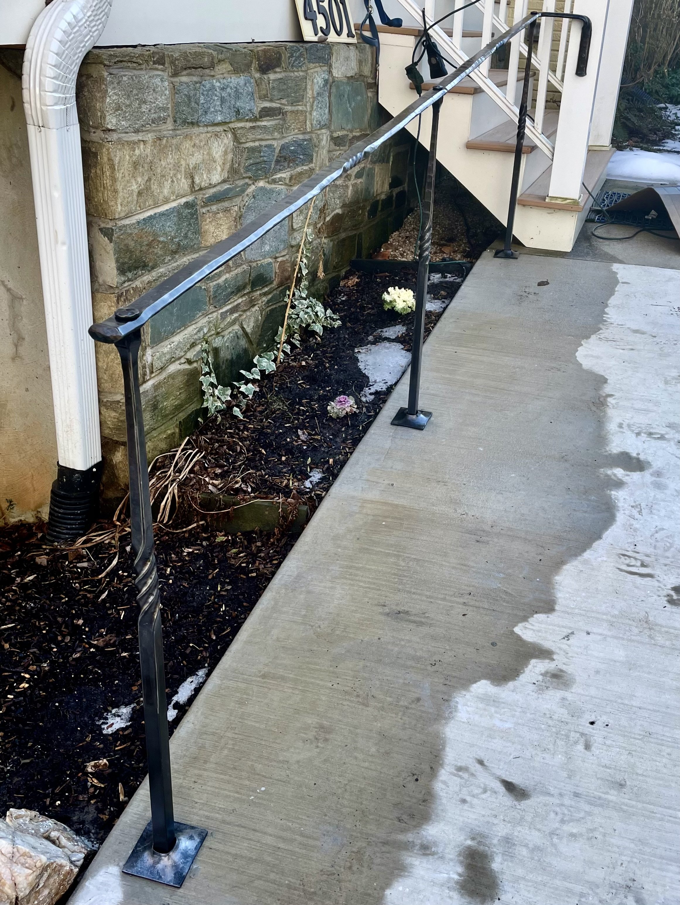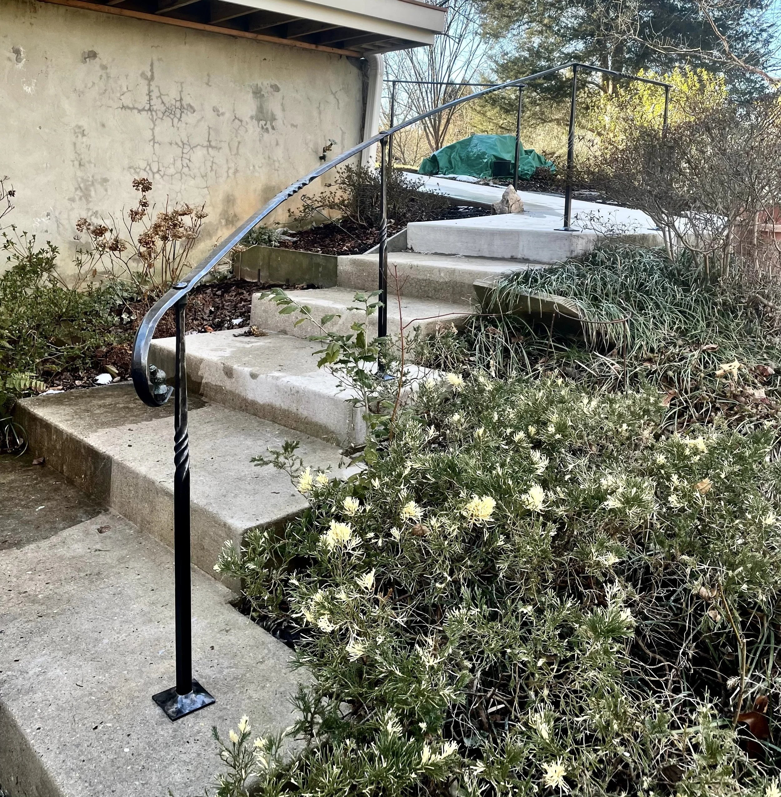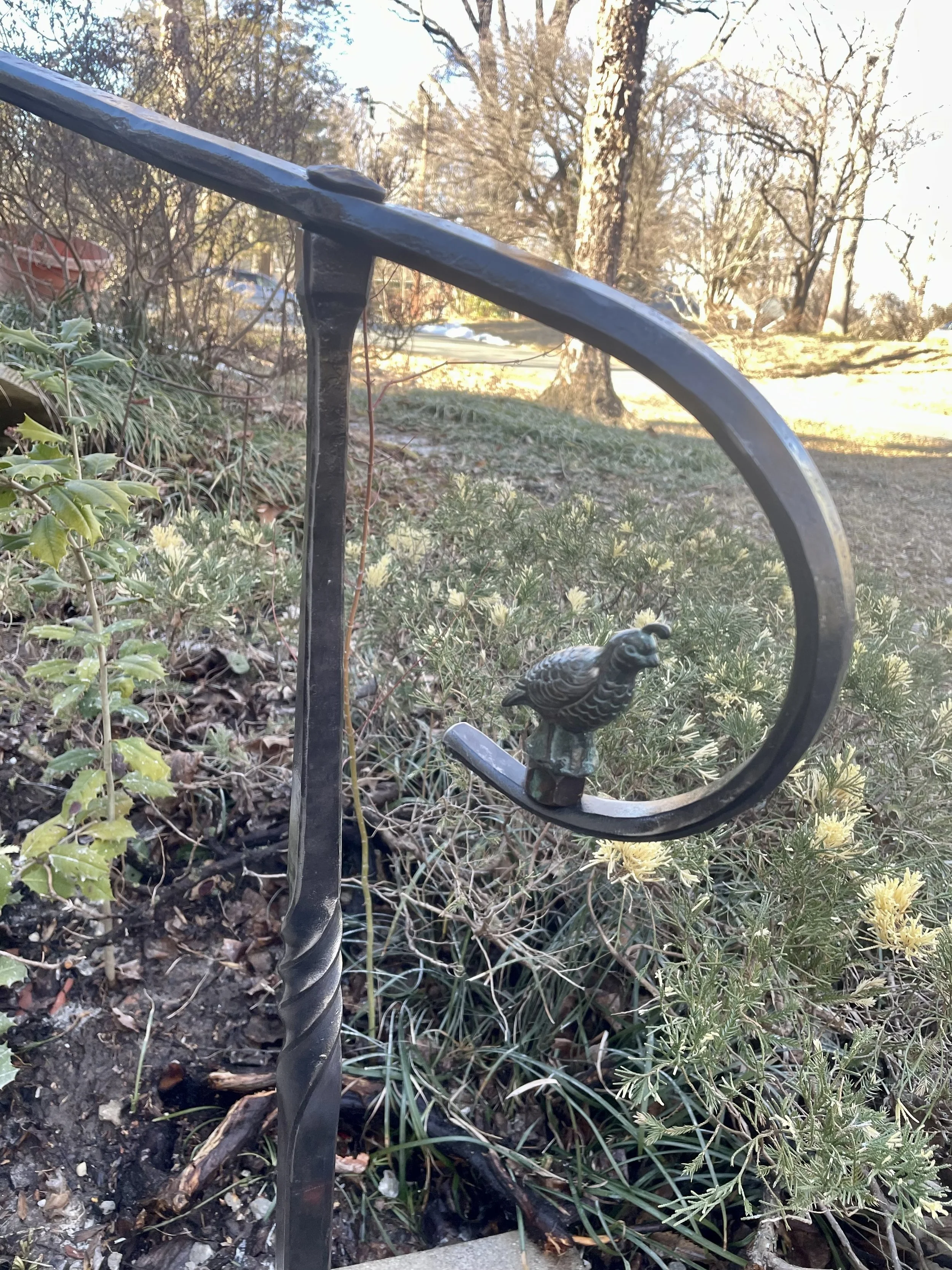 This Bird railing was custom made to match the arch of the staircase as well as the clients house architecture. They also wanted this bronze bird INCORPORATED which is placed at the bottom scroll